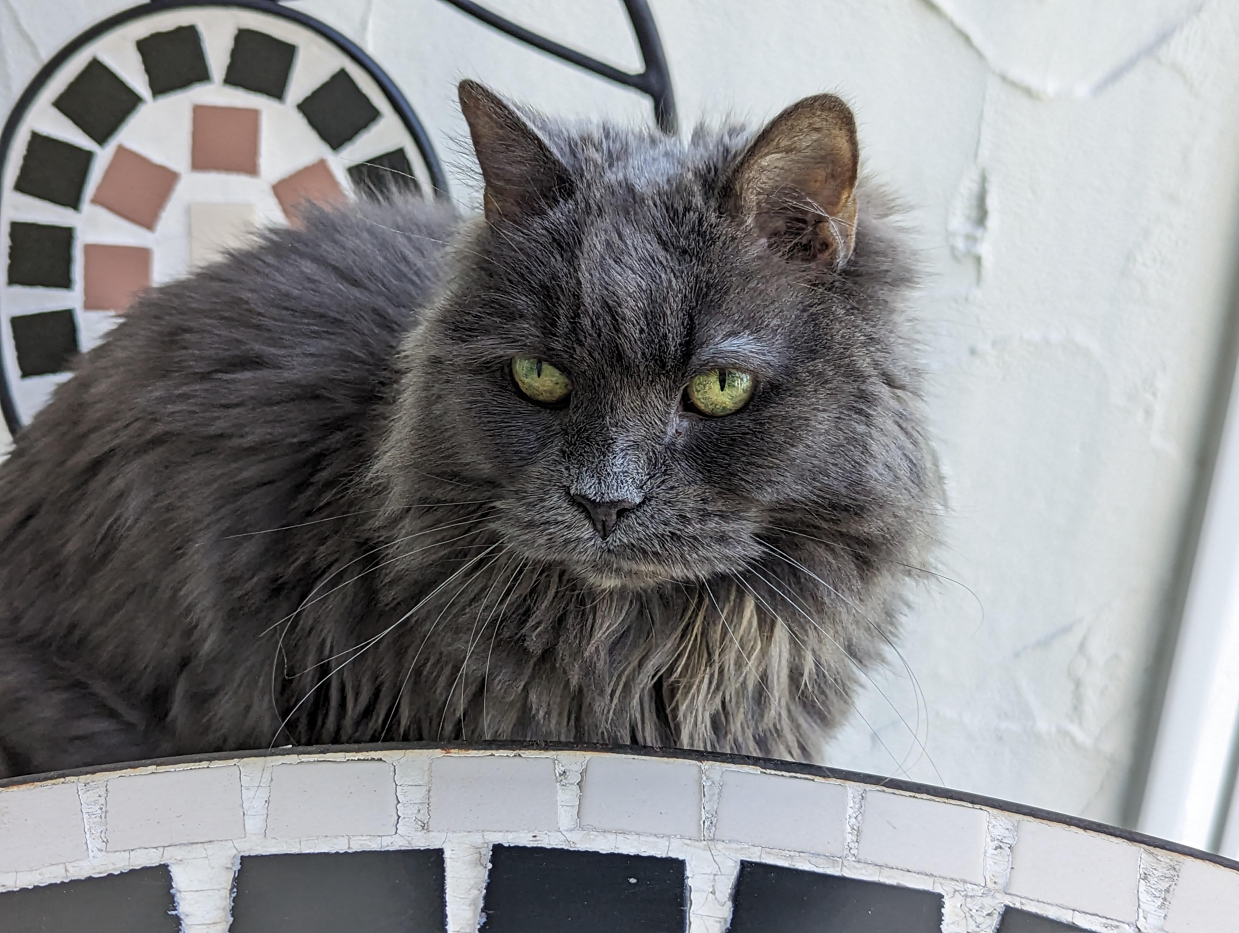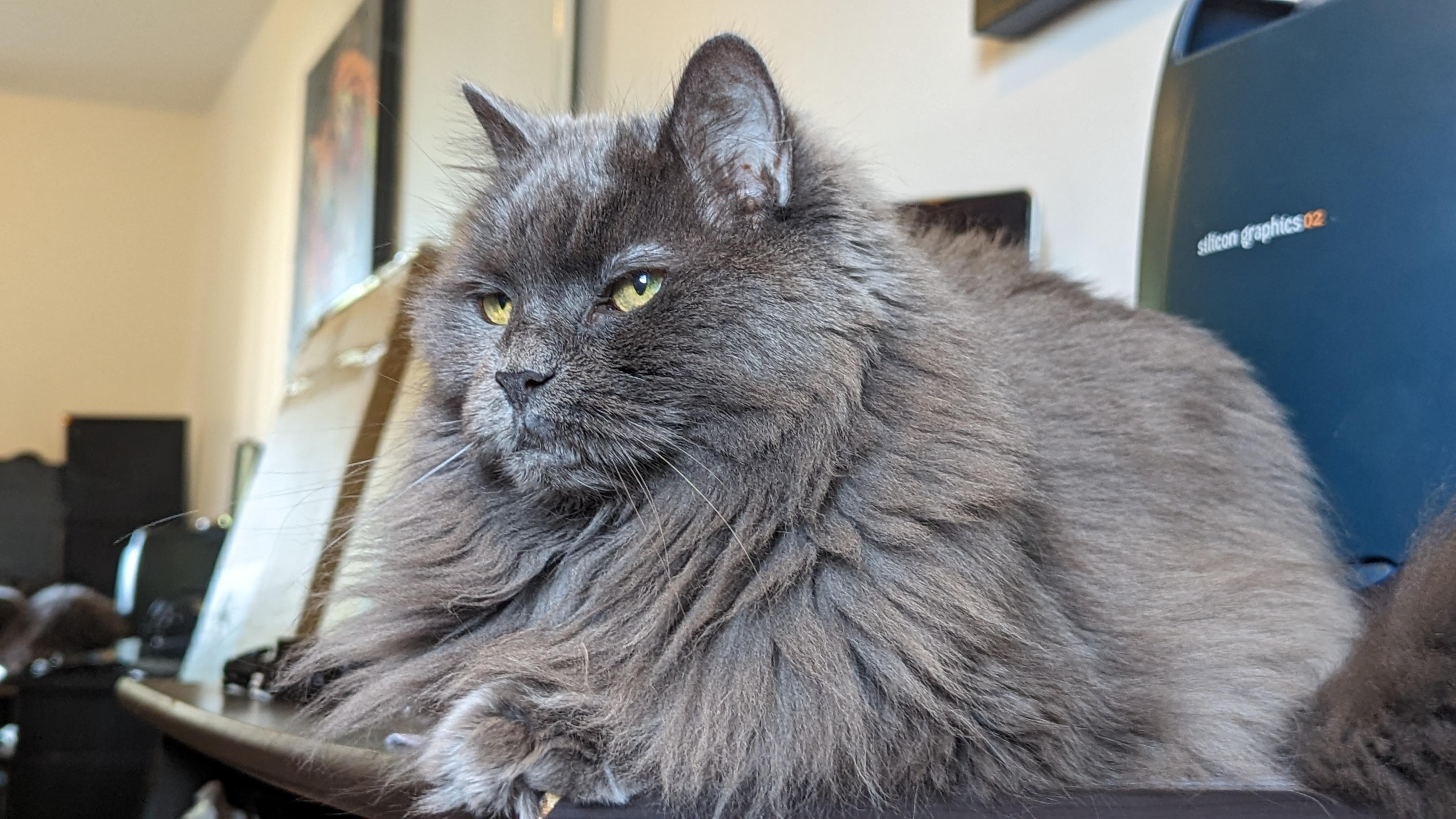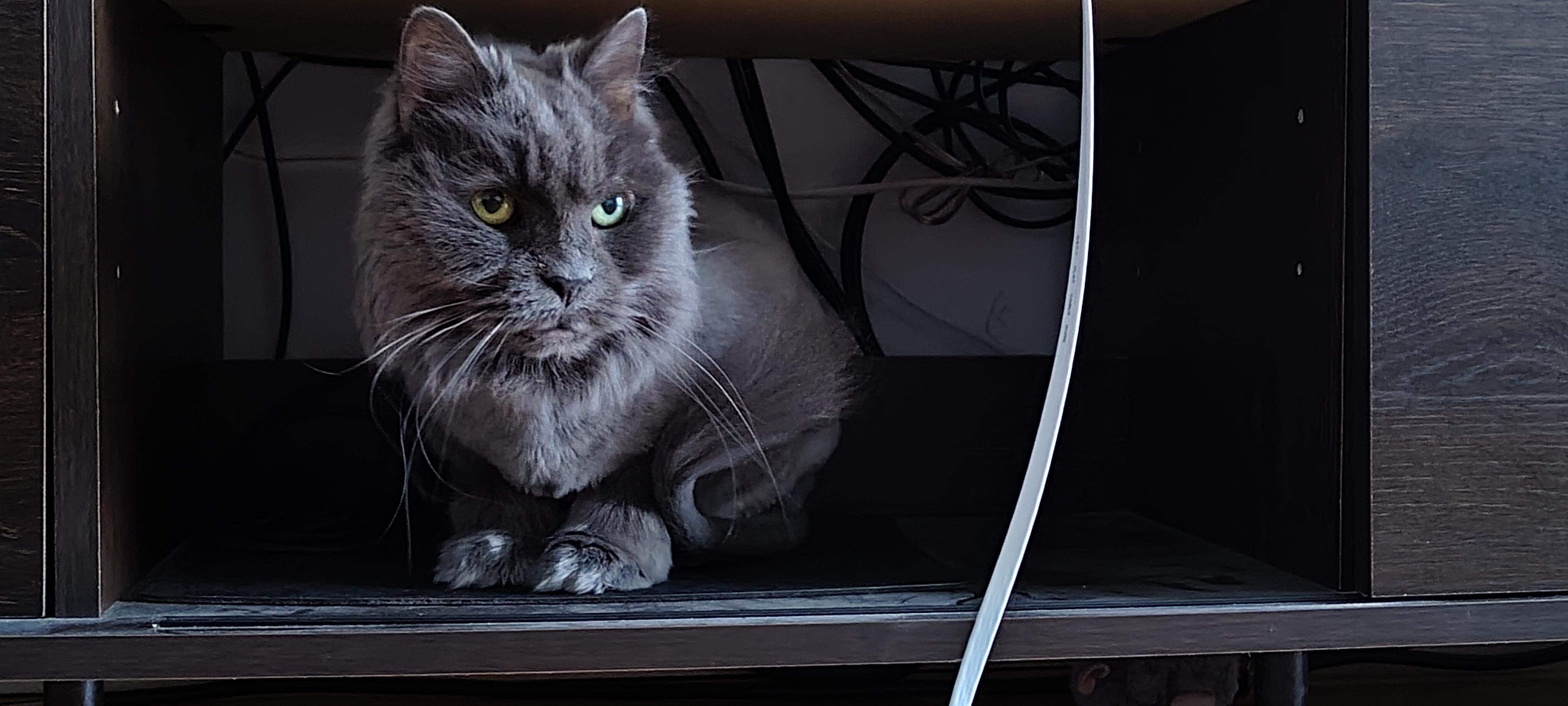 Toupie is a 16 year old long-hair blue cat. This cat always sports its grumpy face despite being (I presume) pretty happy. That's even the first thing my father said when he saw the cat for the first time. I got Toupie from a local refuge, during the crazy day of the 1st of July (if you live in Québec, you know why!), at the age of 8. The first weeks were a disaster! Toupie was constantly crying out loud all night long, and everytime I was out. It was so loud, that even outside the appartment, with windows closed, I was able to ear it. I even though of giving up, went as far as calling the local refuge and all. But hey, that little grey ball had probably tromatic experiences in the past and need time to adjust to this sudden change. New place, new smells, new pesky human to deal with 😾.